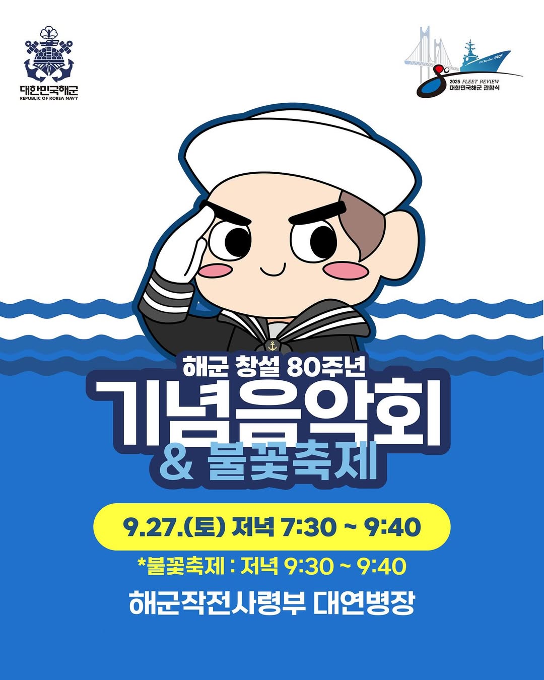 대한민국해군 창설 80주년을 국민과 함께 축하하기 위해 해군이 마련한 축제에 여러분을 초대합니다![기념음악회ㆍ불꽃축제 즐기기] 9월 마지막 토요일 저녁, 해군작전사령부에서 잊지 못할 이벤트! ▶ 언제 : 9.27.(토) 오후 7:30 (입장 : 오후 6:00 - 7:00) ▶ 어디서 : 해군작전사령부 대연병장▶ 어떻게: 사전신청 필수!https://navy80.kr/registration3.asp