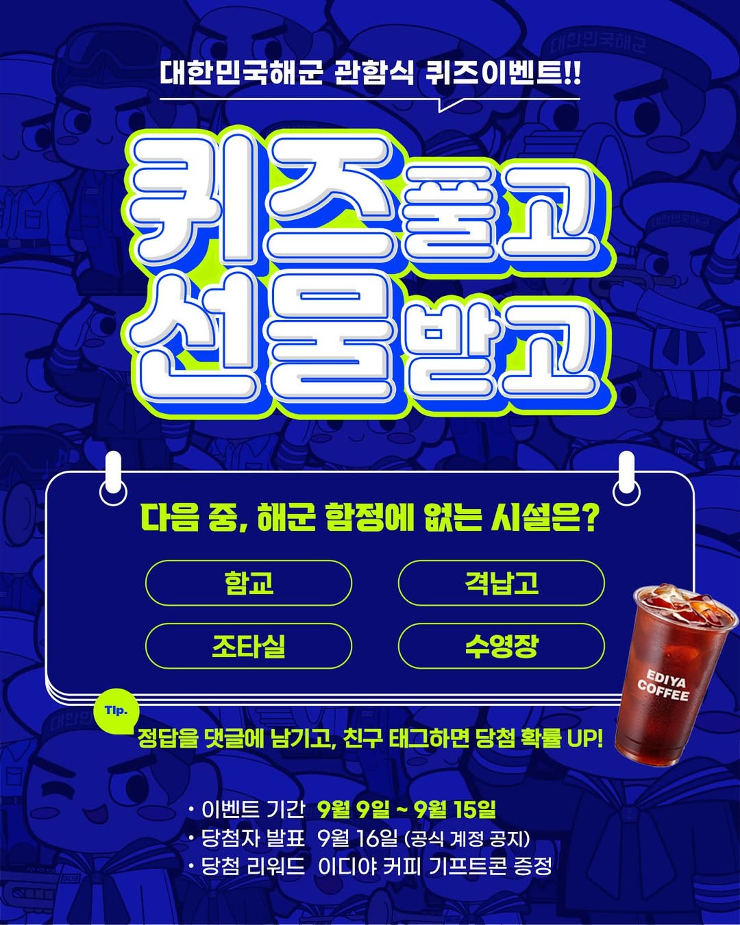 정답 맞추고, 친구 태그 한 80명에게, 커피쿠폰 드려요! 관함식 공식 인스타그램으로 go go!