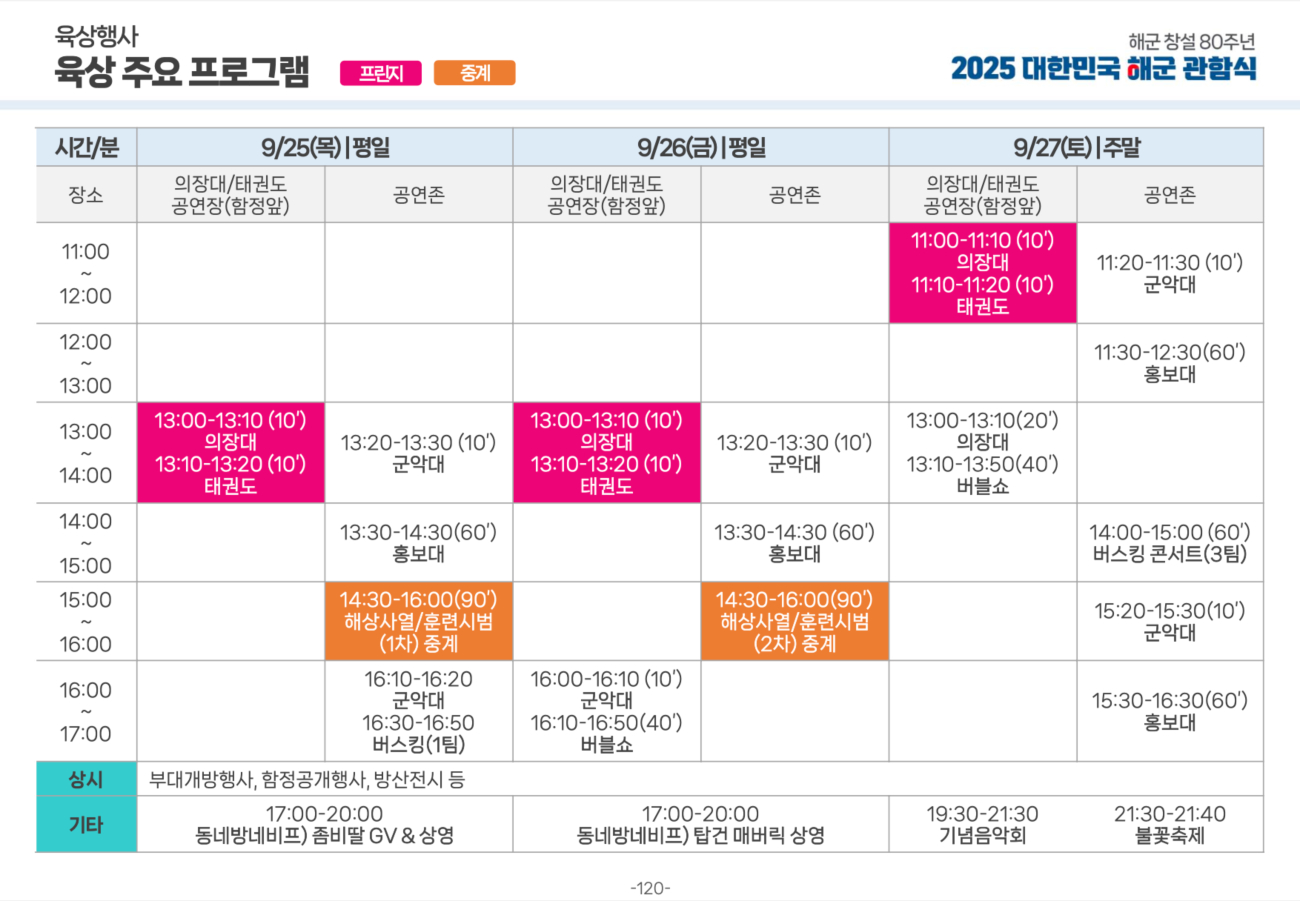 - 장소 : 군악대·홍보대(공연존), 의장대(함정공개행사장 부두)